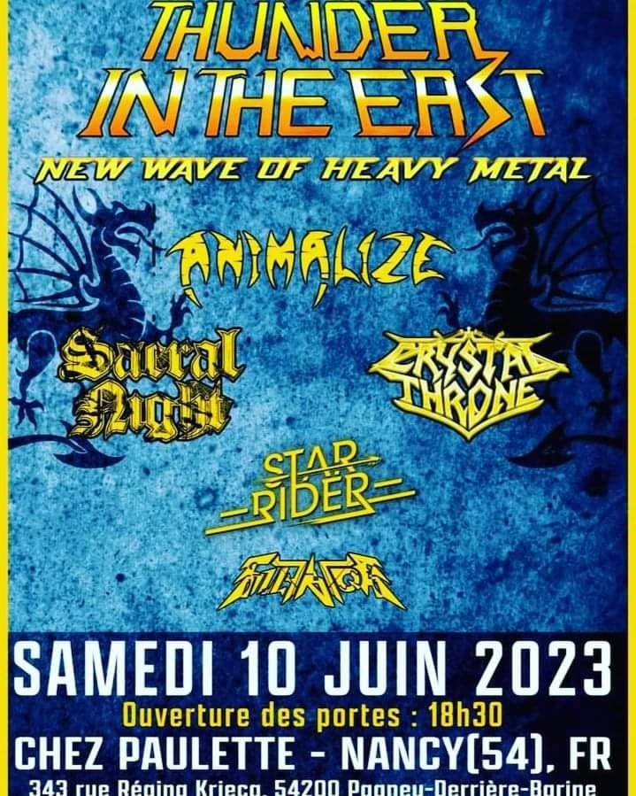On Saturday the 10th of June 2023 Thunder in the East will be hitting the rock pub CHEZ PAULETTE in Nancy, France! This event promises a lineup of five killer bands from the New Wave Of French Heavy Metal world : Crystal Throne , Sulfator , Sacral Night ANIMALIZE and Star Rider !