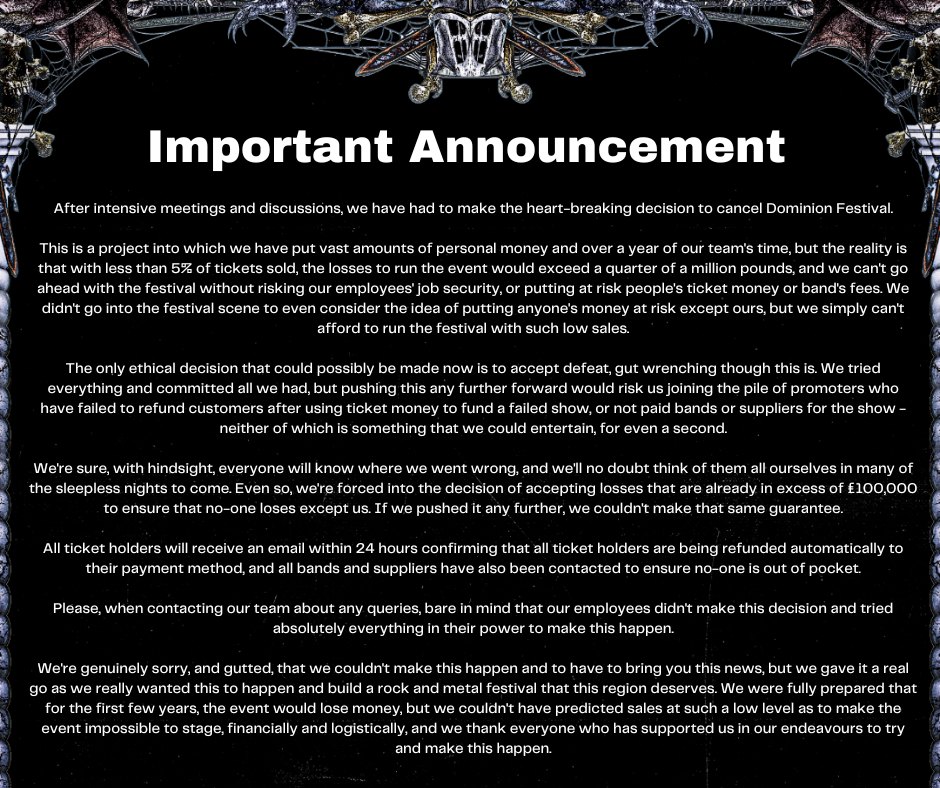 In the north of the UK, a team of promoters were ready to launch Dominion festival after previous setbacks , but for the 2nd time, have sadly had to cancel the festival. Despite an amazing lineup, the festival had poor ticket sales and so it has been pulled last minute. Here is what the festival had to say.