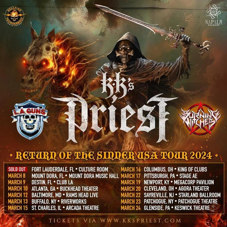 The wait is almost over! KK’S PRIEST – featuring Judas Priest alum and GRAMMY Award-winning/nominated musicians K.K. Downing (guitar) and Tim “Ripper” Owens (vocals) – will kick off their very first USA headline tour tomorrow at a sold-out show in Fort Lauderdale, FL. Along for the wild ride are L.A. Guns and Napalm Records label mates BURNING WITCHES, so get your tickets now and don’t miss this stellar line-up!