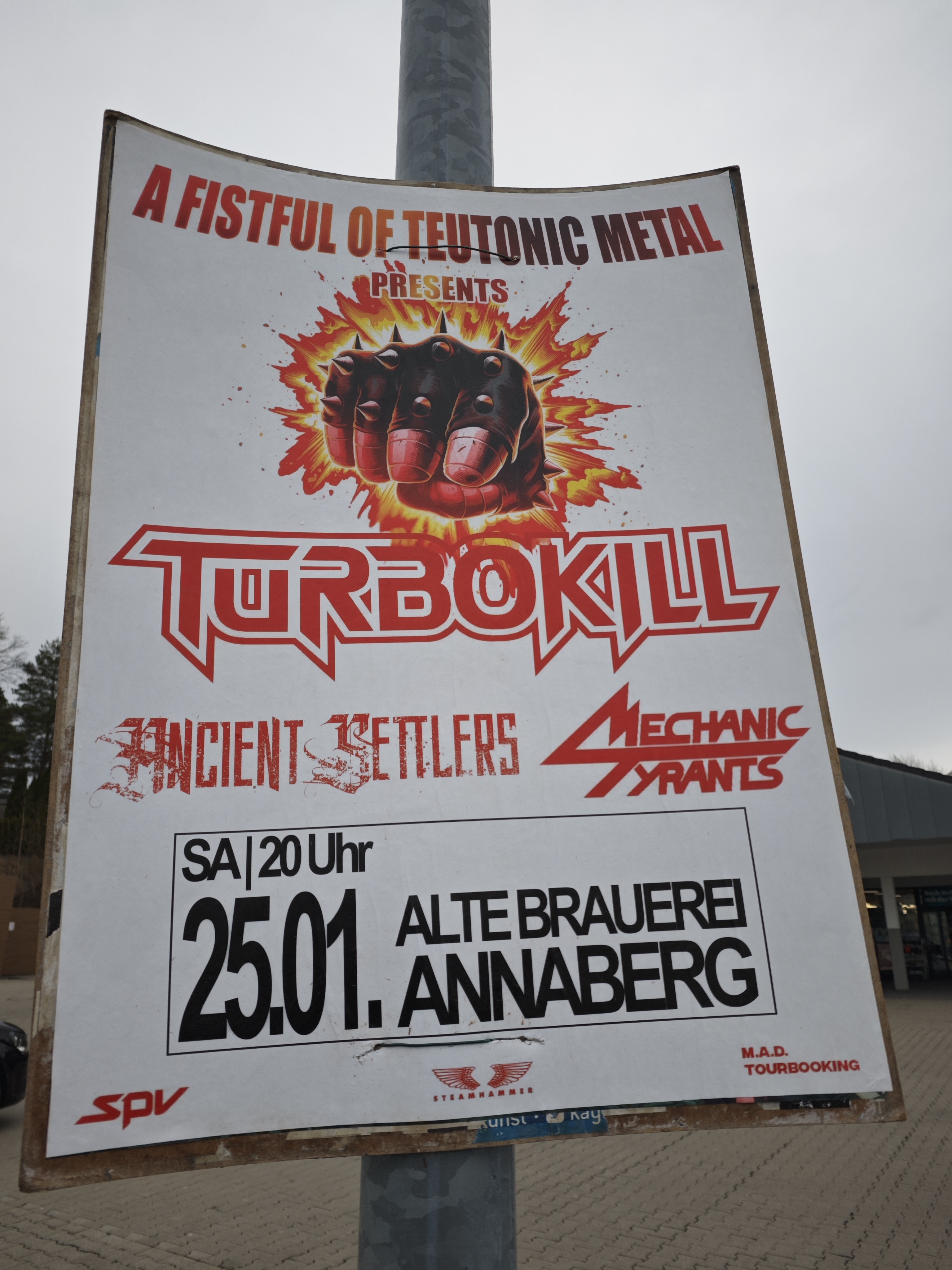 Show day! Relaxed morning of walking around and enjoying the scenery. Peace and quiet are everywhere, not a single metalhead in sight so far. The wild discovery came all of a sudden, when spotted a very well-placed big poster for tonight show, just in front of one of the big local supermarkets. Attention is the currency of the age and by far seems the locals should be properly informed about what’s going to happen in their town on Saturday night. It’s getting dark outside and way colder, which is a sign to pump couple of beers and few shots, finally putting on full metal gear and finding my way to The Old Brewery, as the venue is popular around here. What a promising name I say!